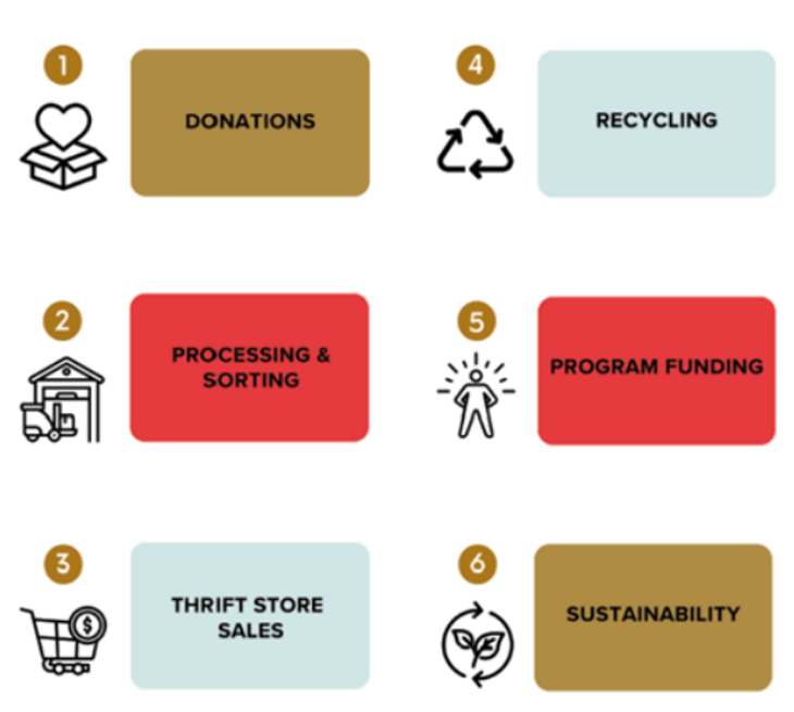 - Items suitable for resale are sent to Thrift Store Sales, to be purchased by consumers.