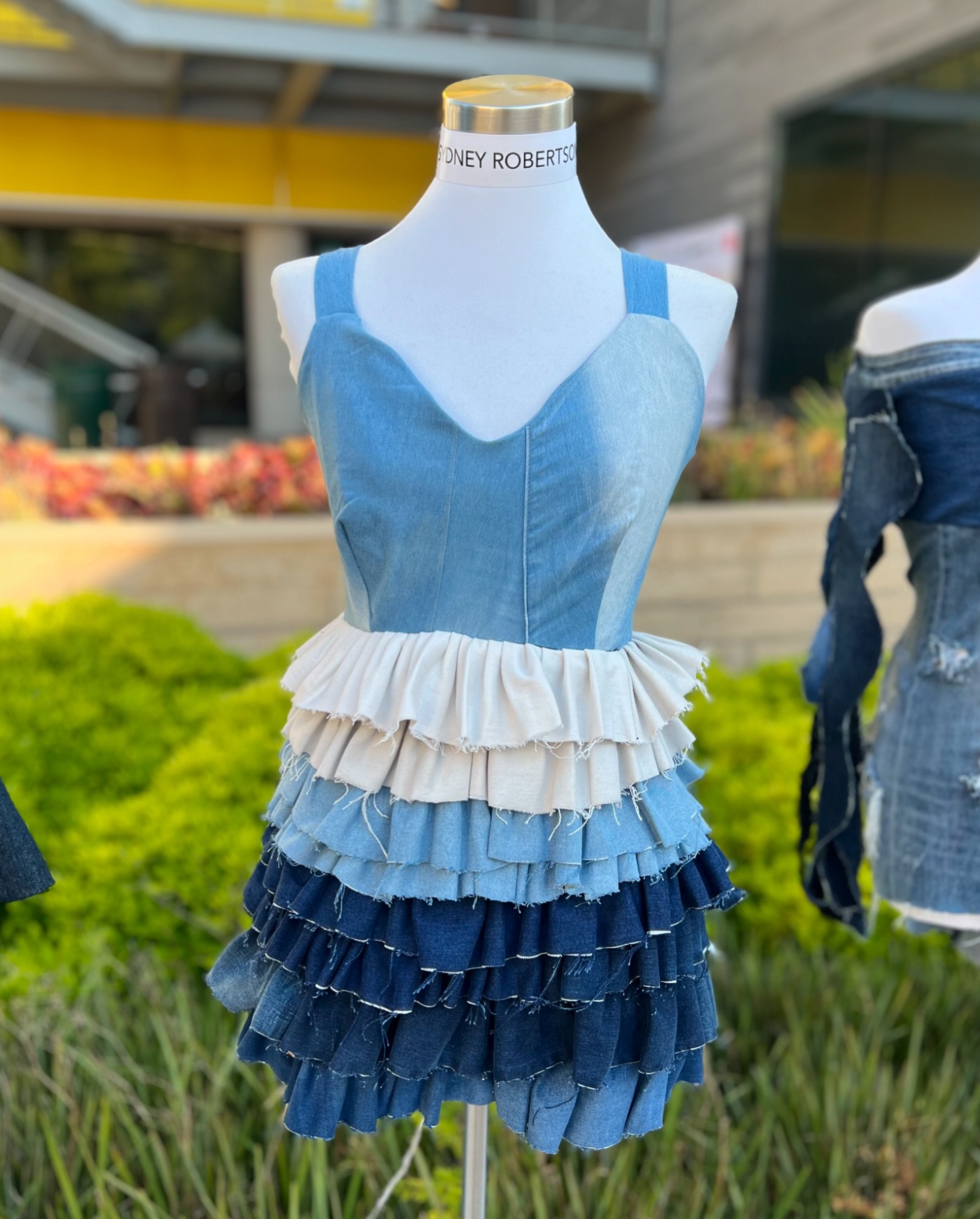 As the models strutted around the final corner of the runway, they each passed a line of five mannequins sporting denim looks— a corset, collar, coat and several dresses— also designed by students.